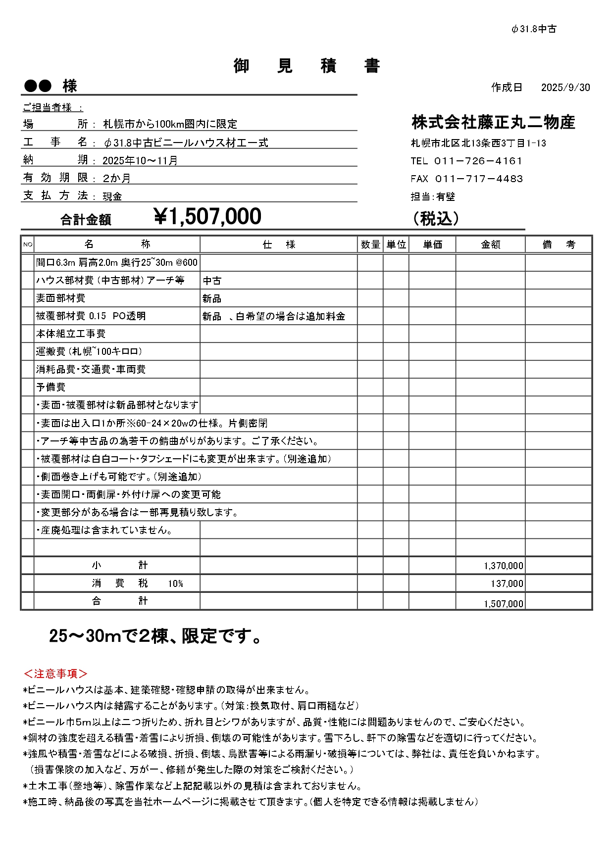 新着お知らせ2025年9月30日中古ビニールハウス(φ31.8)の材工一式のご案内