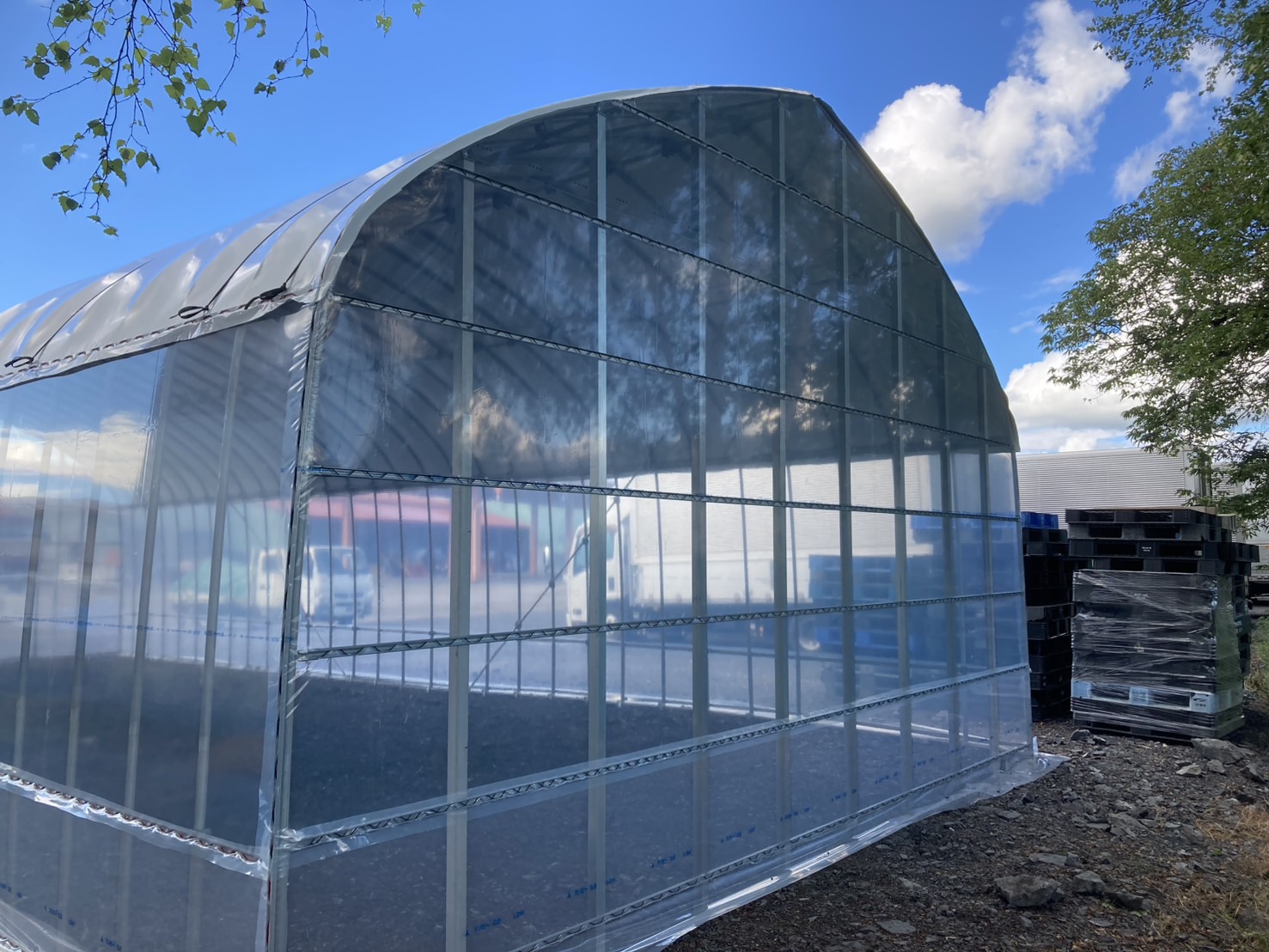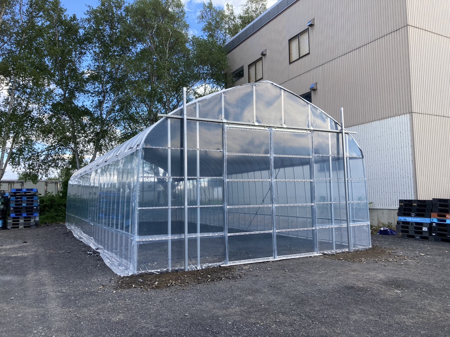 同クラスの中古品の設置例(今年納品、倉庫として使用するため、屋根フィルムが白白コート5)